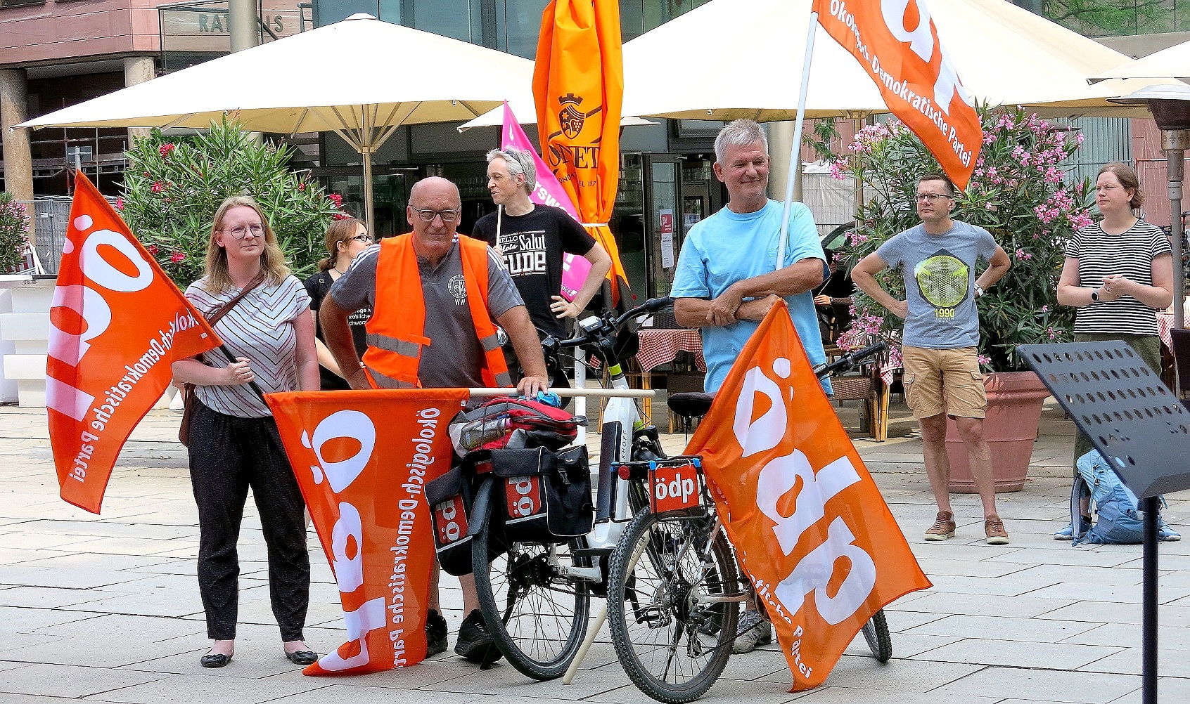 Bei einer Autofahrt mit 160 km/h verbraucht man bis zu zwei Drittel mehr Sprit als mit 100 km/h. Das hat der ADAC berechnet. Die Argumente für ein Tempolimit - deutliche Spritersparnis, weniger schwere Unfälle, entspannteres Fahren, einfache und schnelle Umsetzbarkeit... sind hinlänglich bekannt. Auch, dass eine große Mehrheit ein Tempolimit befürworten würde und dass angesichts des Krieges in der Ukraine jetzt Sparen deutlich angesagt ist, kann einen FDP-Verkehrsminister bisher nicht überzeugen. Dies zu ändern war Ziel der Kundgebung in Aschaffenburg. Ein Bündnis aus ÖDP, B90/Grüne, KI, SPD. ADFC, BN und Verkehrsinitiative Hösbach beteiligte sich daran.