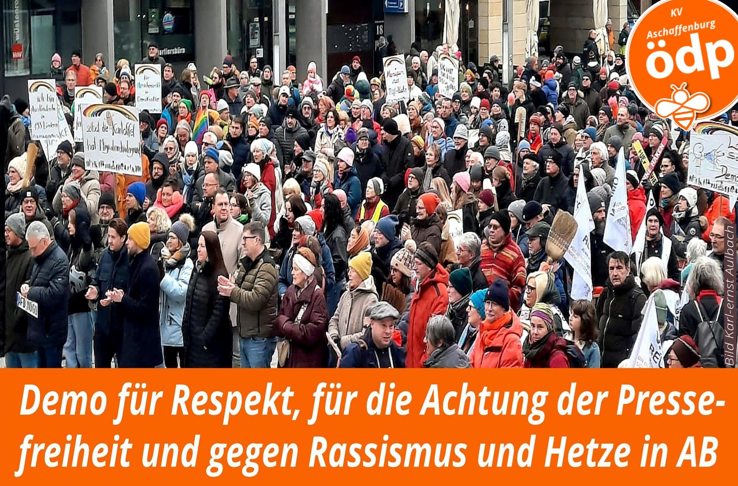 Ungefähr 1.000 Aschaffenburger demonstrierten für den Respekt vor unserem Rechtsstaat, seinen Institutionen, für die Achtung der Pressefreiheit und gegen Rassismus und Hetze. Erfreulich, dass alle Redner auch unseren Polizisten in Aschaffenburg dankten, die sich für unsere Sicherheit einsetzen. Die Ökologisch-Demokratische Partei bedankt sich bei den Veranstaltern und freut sich, wenn es beim nächsten Kehraus am 31.12.2026 mehr als 1.000 Teilnehmer werden. Sagen Sie uns gerne Ihre Meinung. Bernhard Schmitt