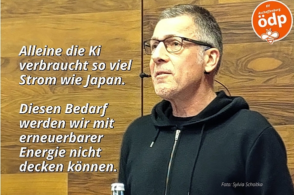 Auf Einladung der ÖDP Aschaffenburg sprach Prof. Dr. Paech zum Thema „Klimaschutz, De-Industrialisierung und Postwachstum“. „Die KI verbraucht so viel Strom wie ganz Japan". Dies nannte Paech als Beispiel für die Schwierigkeiten, die der Wunsch nach permanentem Wirtschaftswachstum verursacht. „Diesen Bedarf werden wir mit Erneuerbarer Energie nicht decken können" betonte der Ökonom von der Uni Siegen. Zudem müssten wir unseren Lebensstil ändern, da 85 % der Deutschen mehr CO2 freisetzen, als es unser Planet verträgt. Von der Politik erwartet er keine Lösung, weil die Politik regelmäßig nur Themen setzt, für die es bereits eine gewisse Bereitschaft gibt. Die muss aber erst noch auf kommunaler Ebene geschaffen werden. Sagen Sie uns gerne Ihre Meinung.